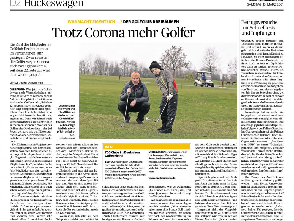 In der Bergischen Morgenpost ist am Samstag, den 13.03.2021 ein Bericht über unseren Golfclub erschienen. Unter der Rubrik „Was macht eigentlich…“ ist ein schönes Gespräch mit unserem Clubmanager und Spielführer Erich Buchholz über den Club und das Golfspielen während der Pandemie entstanden.