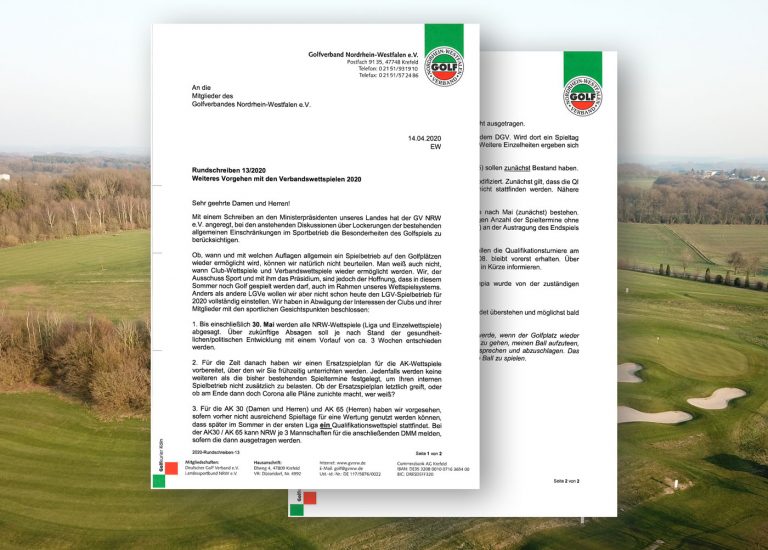 Der Golfverband NRW hat in einem Rundschreibem vom 14. April auf das weitere Vorgehen mit den Verbandwettspielen informiert. Dieses Schreiben möchten wir Ihnen hiermit zugänglich machen.