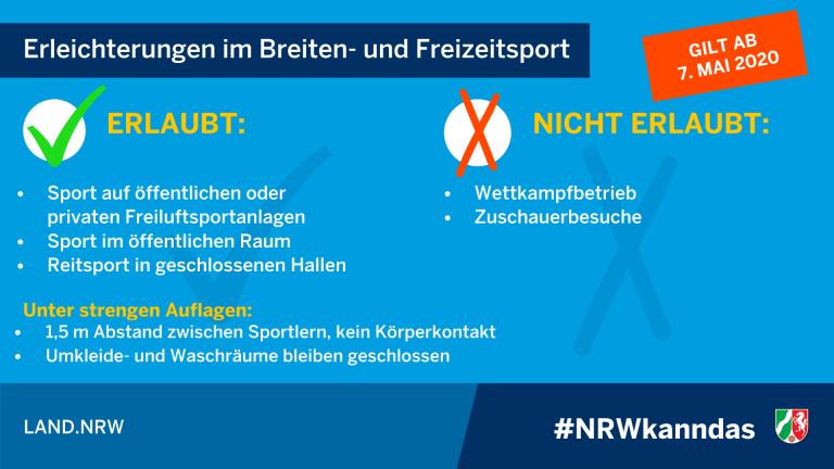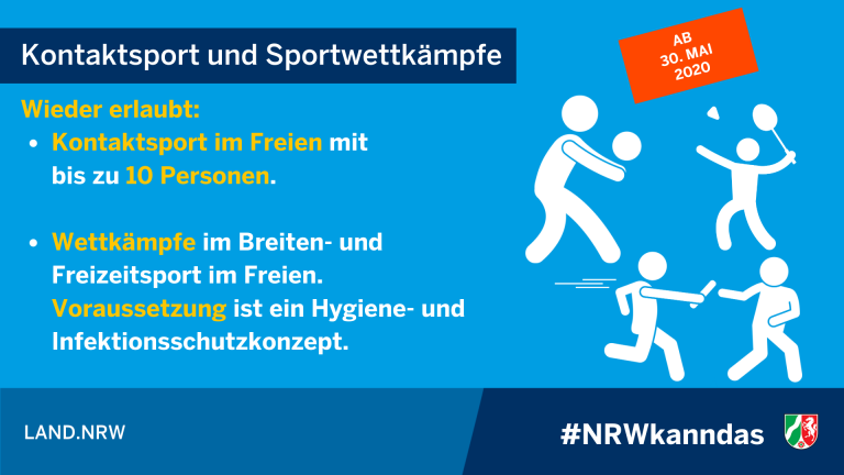 Gestern wurden wir darüber informiert, dass ab morgen, weitere Öffnungen der Anti-Corona-Maßnahmen gelten. Für den Bereich Sport sieht die neue Corona-Schutzverordnung der Landesregierung Nordrhein-Westfalen dabei ab dem 30. Mai 2020 folgende Erleichterungen vor: