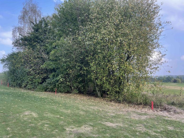 Wir haben die Spielverbotszone am rechten Fairwayrand der Bahn drei (rechts vom Baum) geändert. Hier befinden sich jetzt rote „Penalty-Area-Pfähle“ ohne schwarze Kappe. Liegt der Kreuzpunkt ihres Schlages in diesem Bereich, liegt der Ball nicht in einer Spielverbotszone. Dies ist nur beim Spielen der Bahn drei bzw. Bahn sieben überhaupt möglich.