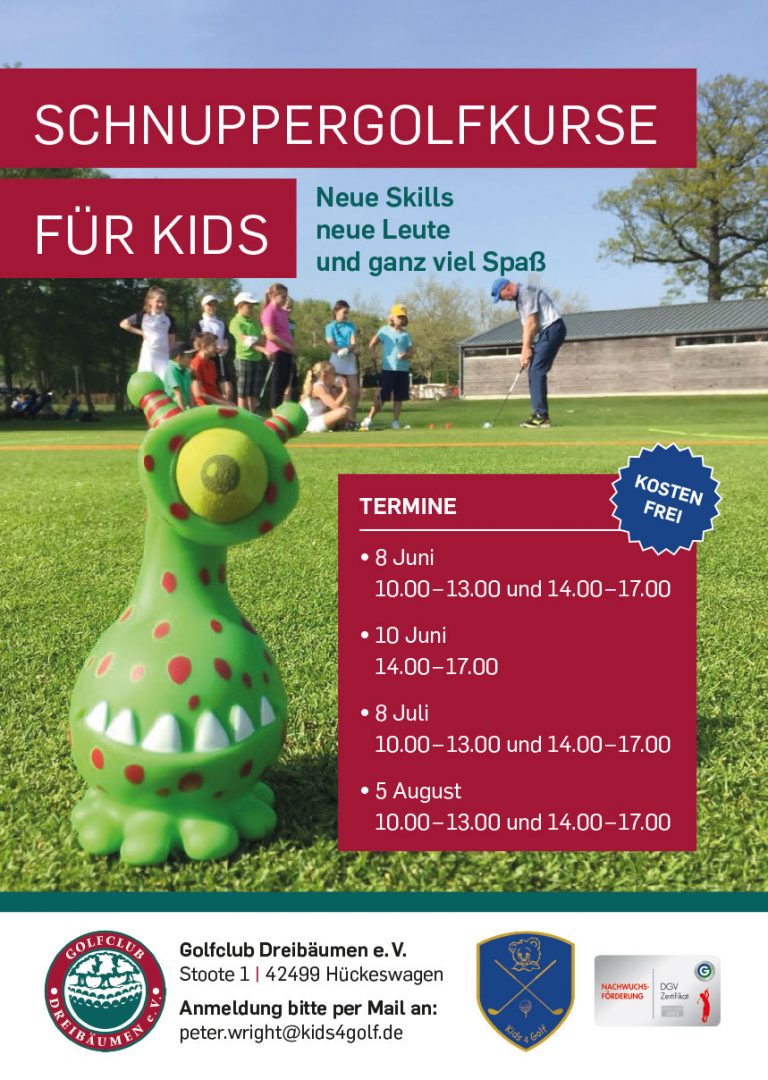 Wir bieten in den kommenden Wochen kostenfreie Schnuppergolfkurse für Kinder an. Anmeldungen per Email: peter.wright@kids4golf.de