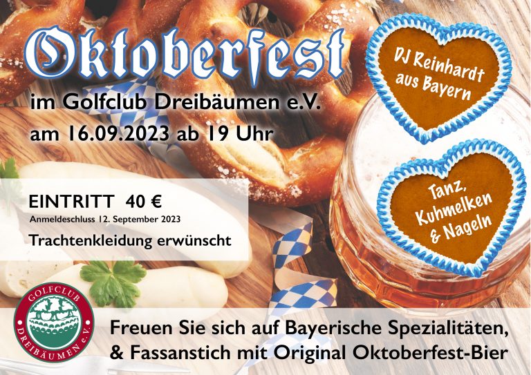 O’ zapft is! Nicht nur in München sondern bald auch bei uns. Am 16. September 2023 ab 19:00 Uhr veranstaltet der Golfclub Dreibäumen sein eigenes Oktoberfest.