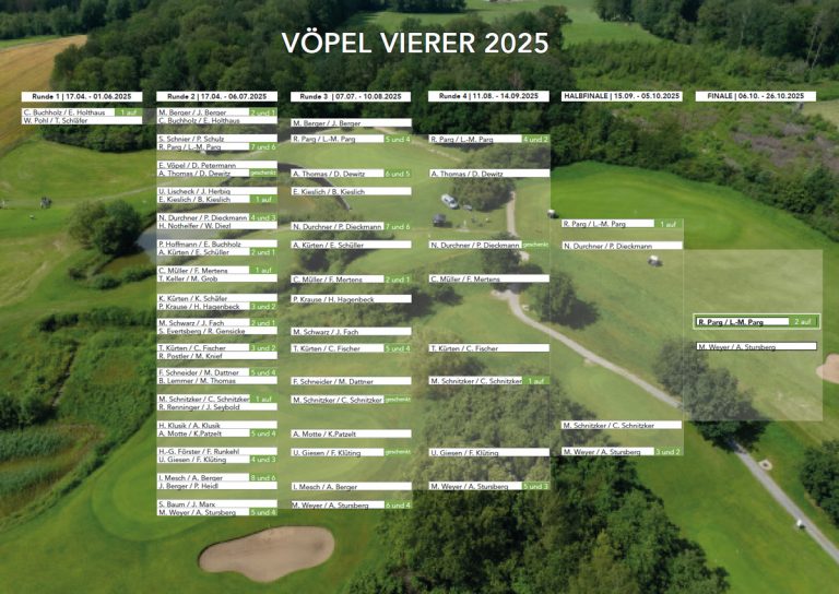 In diesem Jahr wird zum 25. Mal in Folge der Vöpel-Vierer ausgetragen. Insgesamt 66 Spieler-/innen in 33 Teams haben sich mit der festen Absicht angemeldet, ihr Können im Lochwettspielmodus unter Beweis zu stellen und möglichst lange dabei zu sein.