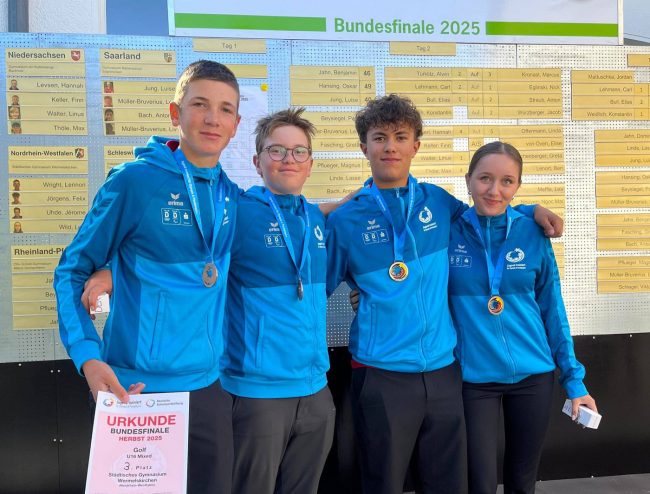 Mit einer Bronzemedaille im Gepäck – errungen bei „Jugend trainiert für Olympia“ (vollständiger Bericht hierzu: Gymnasium Wermelskirchen: Team holt dritten Platz im Golf ) in Berlin – reisten Pete Wright, Nicolas Merklinghaus, Felix Jörgens und Lennon Wright am 25. September nach Bayern zum Golfclub Hohenpähl.