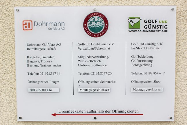 Seit Ende der vergangenen Woche hängt neben dem Eingang des Servicecenters ein neues Hinweisschild mit Zuständigkeiten und aktuellen Öffnungszeiten von Driving Range, Sekretariat und ProShop.