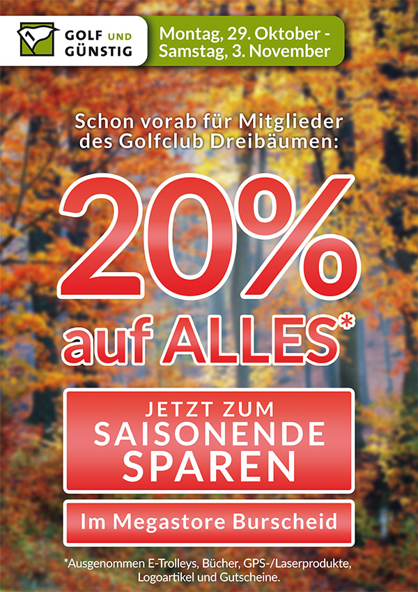 Unser Netzwerkpartner und Pro-Shop-Betreiber Golf und Günstig senkt zum Saisonende radikal die Preise. Schon eine Woche vor Beginn des großen online-Ausverkaufs haben die Mitglieder des Golfclubs Dreibäumen die Möglichkeit, von dieser Rabattaktion zu profitieren.