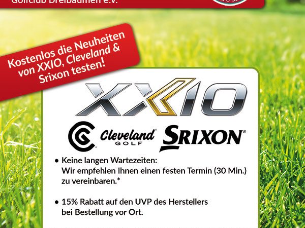 Am Donnerstag, den 7. April von 11-17 Uhr veranstaltet Golf und Günstig wieder einen Demotag in Dreibäumen. Testen Sie kostenlos die Neuheiten der führenden Hersteller XXIO, Srixon und Cleveland.